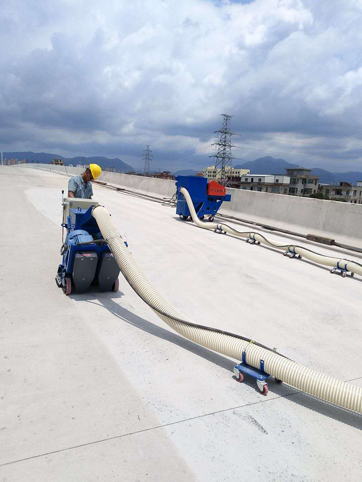 噴涂橋面防水涂料前,首先鑿除混凝土浮漿,平整凸凹不平處,清除油污,垃圾等,然后徹底清掃基面,再用吹塵器把基面吹干凈